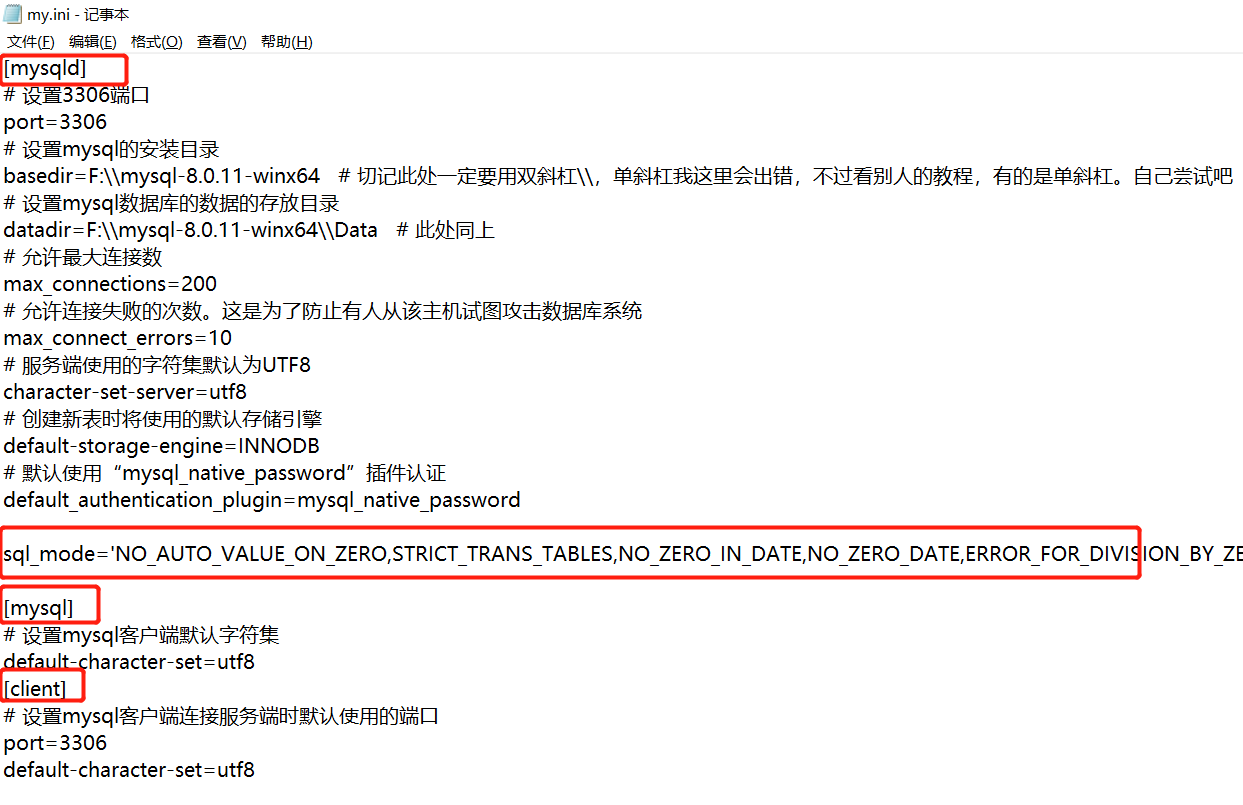 [mysqld]# 設置3307端口(原先的mysql5已經占用3306)port=3307# 設置mysql的安裝目錄(你自己的目錄)basedir='D:\\Environment\\mysql-8.0.30-winx64'# 設置mysql數據庫的數據的存放目錄datadir='D:\\Environment\\mysql-8.0.30-winx64\\data'# 允許最大連接數max_connections=200# 允許連接失敗的次數。max_connect_errors=10# 服務端使用的字符集默認為UTF8character-set-server=utf8# 創建新表時將使用的默認存儲引擎default-storage-engine=INNODB# 默認使用“mysql_native_password”插件認證#mysql_native_passworddefault_authentication_plugin=mysql_native_password#關閉ONLY_FULL_GROUP_BYsql_mode= 'STRICT_TRANS_TABLES,NO_ZERO_IN_DATE,NO_ZERO_DATE,ERROR_FOR_DIVISION_BY_ZERO,NO_ENGINE_SUBSTITUTION'[mysql]# 設置mysql客戶端默認字符集default-character-set=utf8[client]# 設置mysql客戶端連接服務端時默認使用的端口port=3307default-character-set=utf8配置中標紅部分為解決問題的部分,其中注意配置需要有單引號包裹,如果你是mysql5.x,可以加上NO_AUTO_CREATE_USER;如果你是mysql8.x,則不需加上,若你加上,則會發生服務無法啟動的情況。