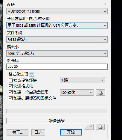 3、插上U盤,點(diǎn)擊打開Rufus軟件界面。在創(chuàng)建一個(gè)啟動(dòng)盤的后面選擇ISO鏡像,點(diǎn)擊其右側(cè)的光盤圖標(biāo)選擇加載路徑。然后點(diǎn)擊【開始】進(jìn)行系統(tǒng)盤制作。