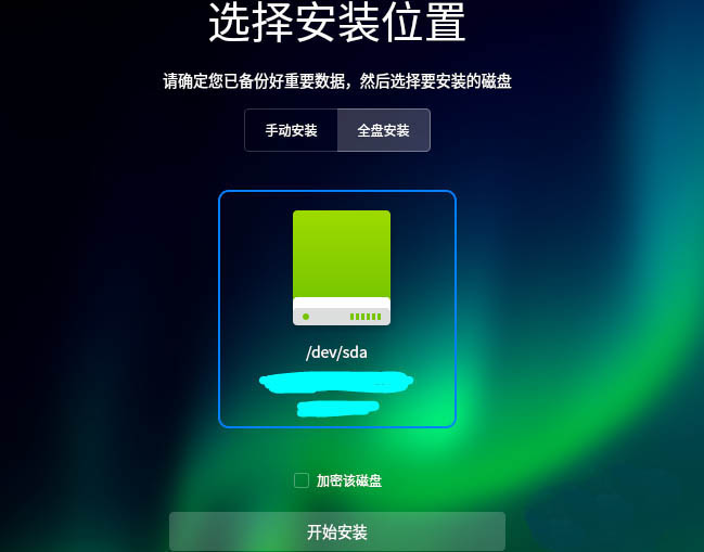 7、選擇安裝位置,此處選擇【全盤安裝】,點(diǎn)擊下面的硬盤圖標(biāo),如果需要全盤加密的話,勾選加密選項(xiàng)。然后點(diǎn)擊【開始安裝】。