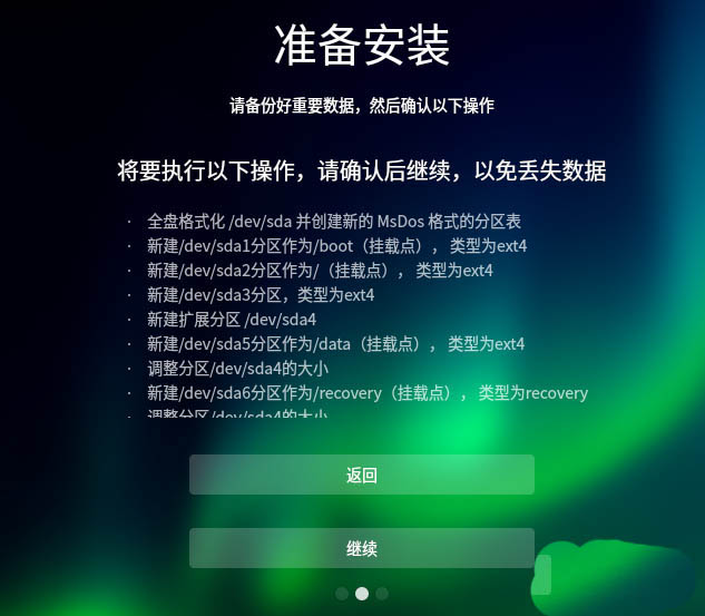 8、系統(tǒng)將被寫入硬盤,如果需要修改的話,點(diǎn)擊【返回】進(jìn)行相關(guān)的操作。確認(rèn)無誤的話,點(diǎn)擊【繼續(xù)】。