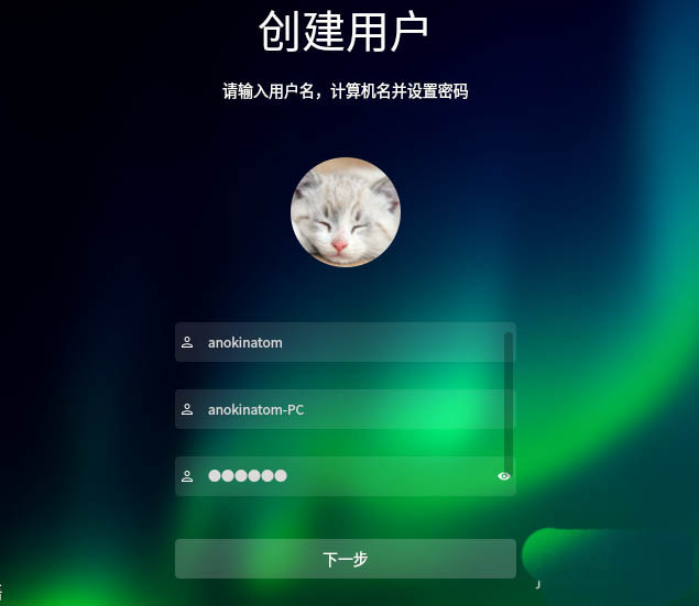11、創(chuàng)建用戶名及密碼。輸入用戶名,自動(dòng)生成計(jì)算機(jī)名,輸入密碼,再次輸入密碼確認(rèn)。然后點(diǎn)擊【下一步】。